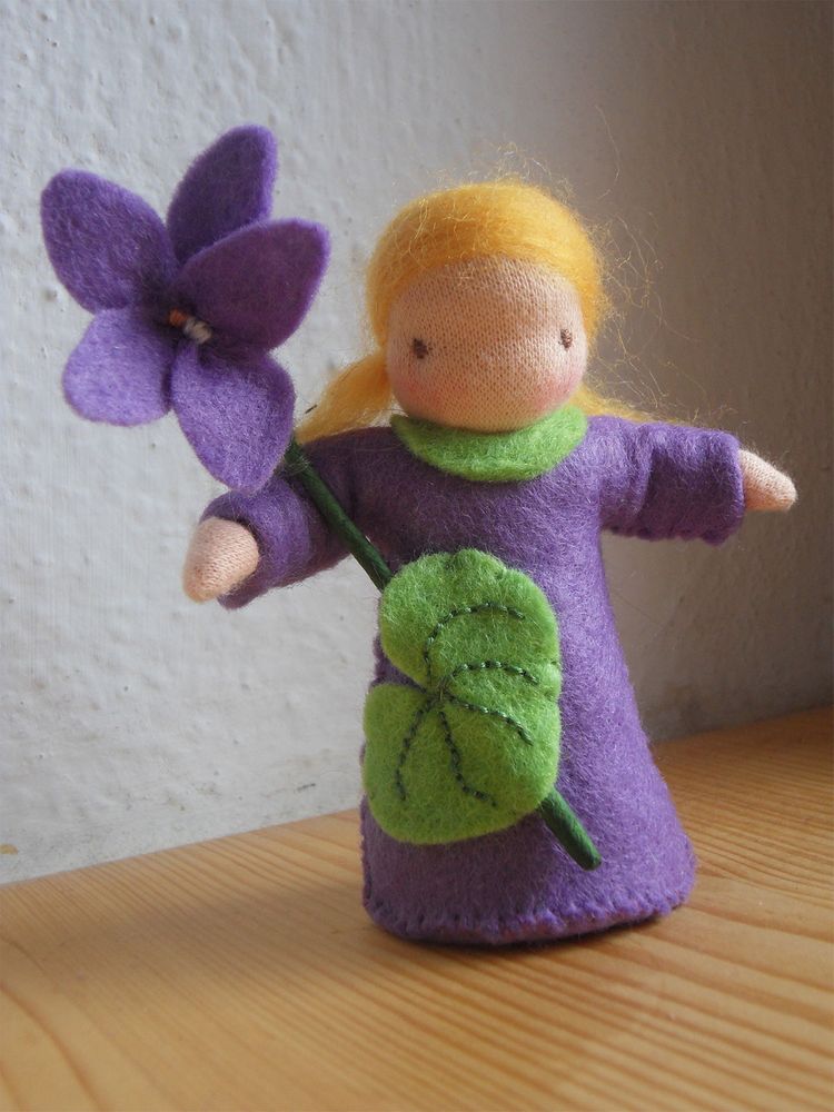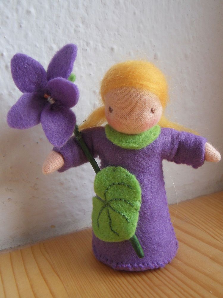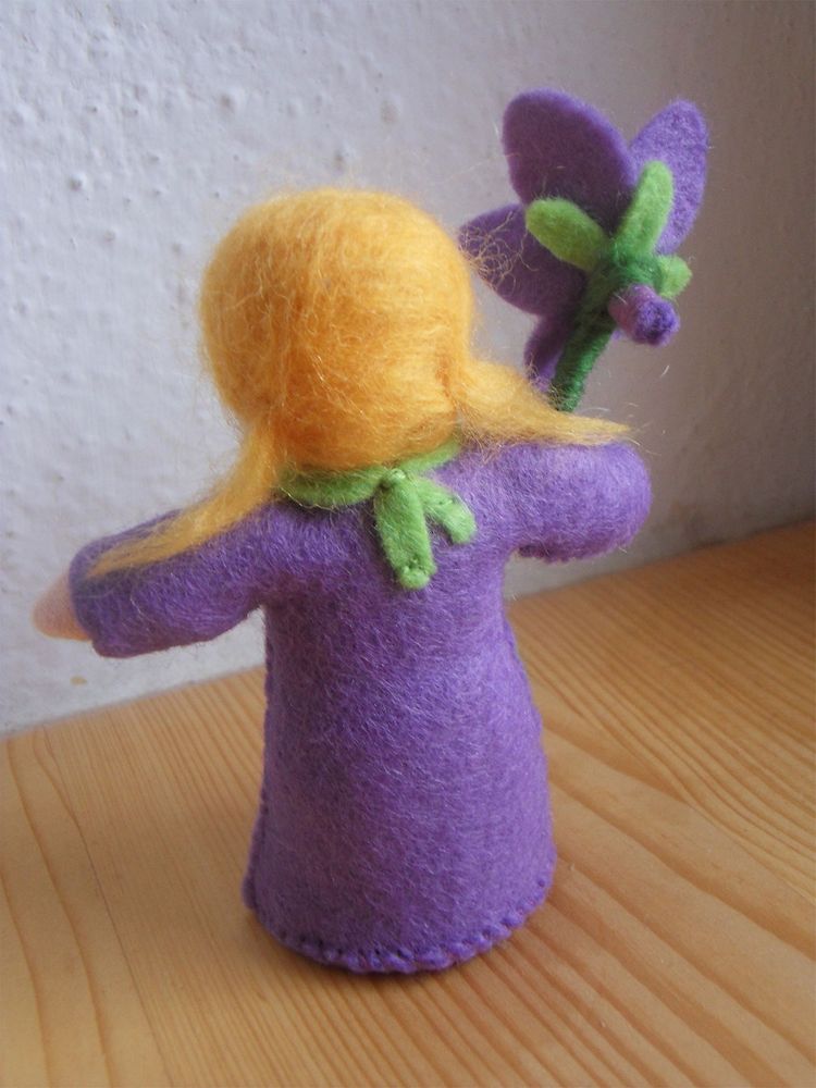 Panenka Fialka je ušitá z přírodních materiálů, hlavička je vyvázaná klasickou technikou pro šití waldorfských panenek. Celá panenka je vyplněná ovčím rounem. V ruce drží panenka květ fialky ušitý z filcu. Výška celé postavičky včetně květu je cca 11 cm.