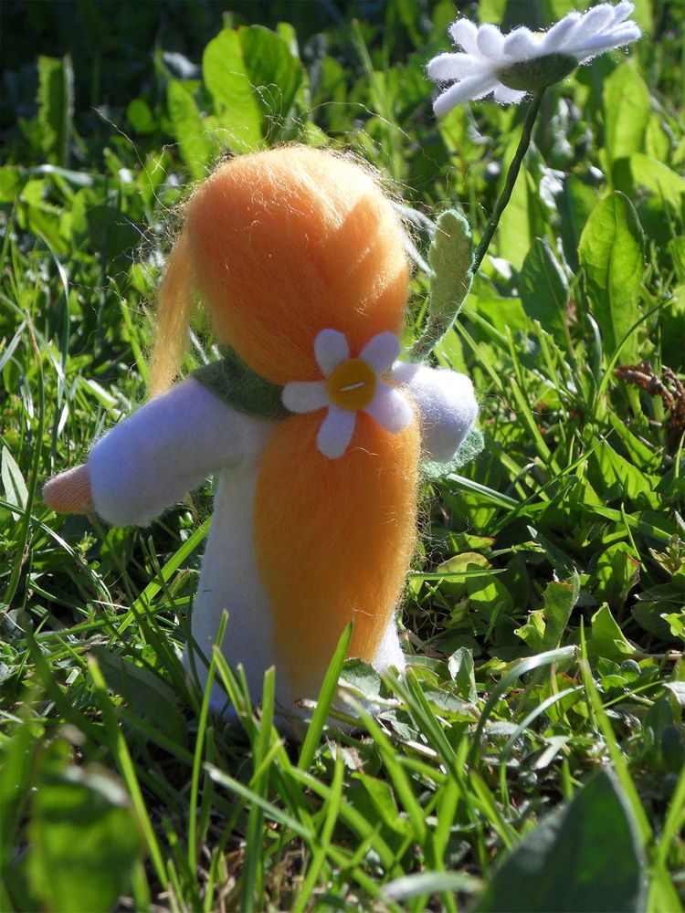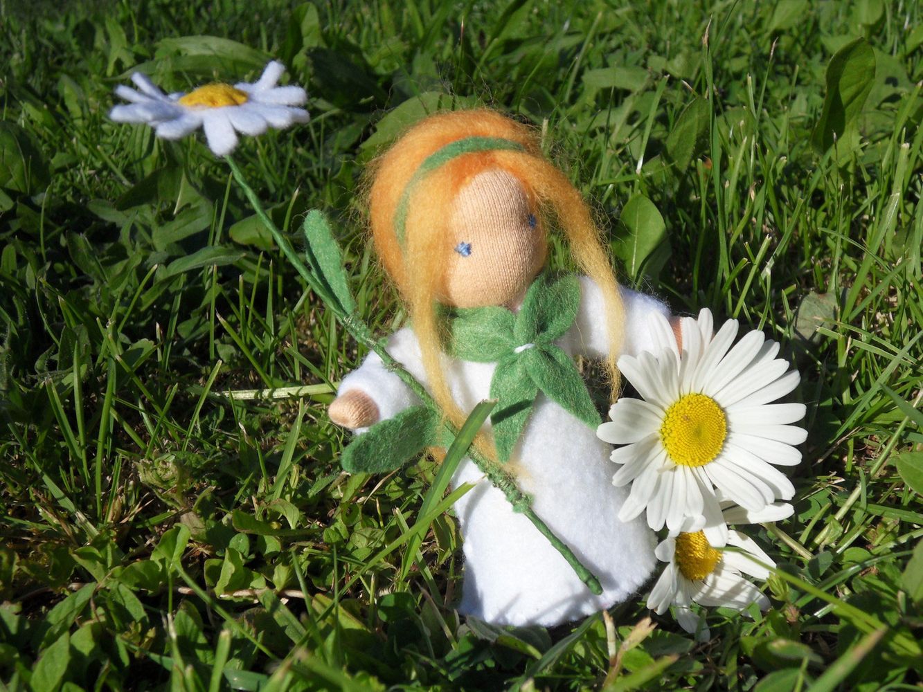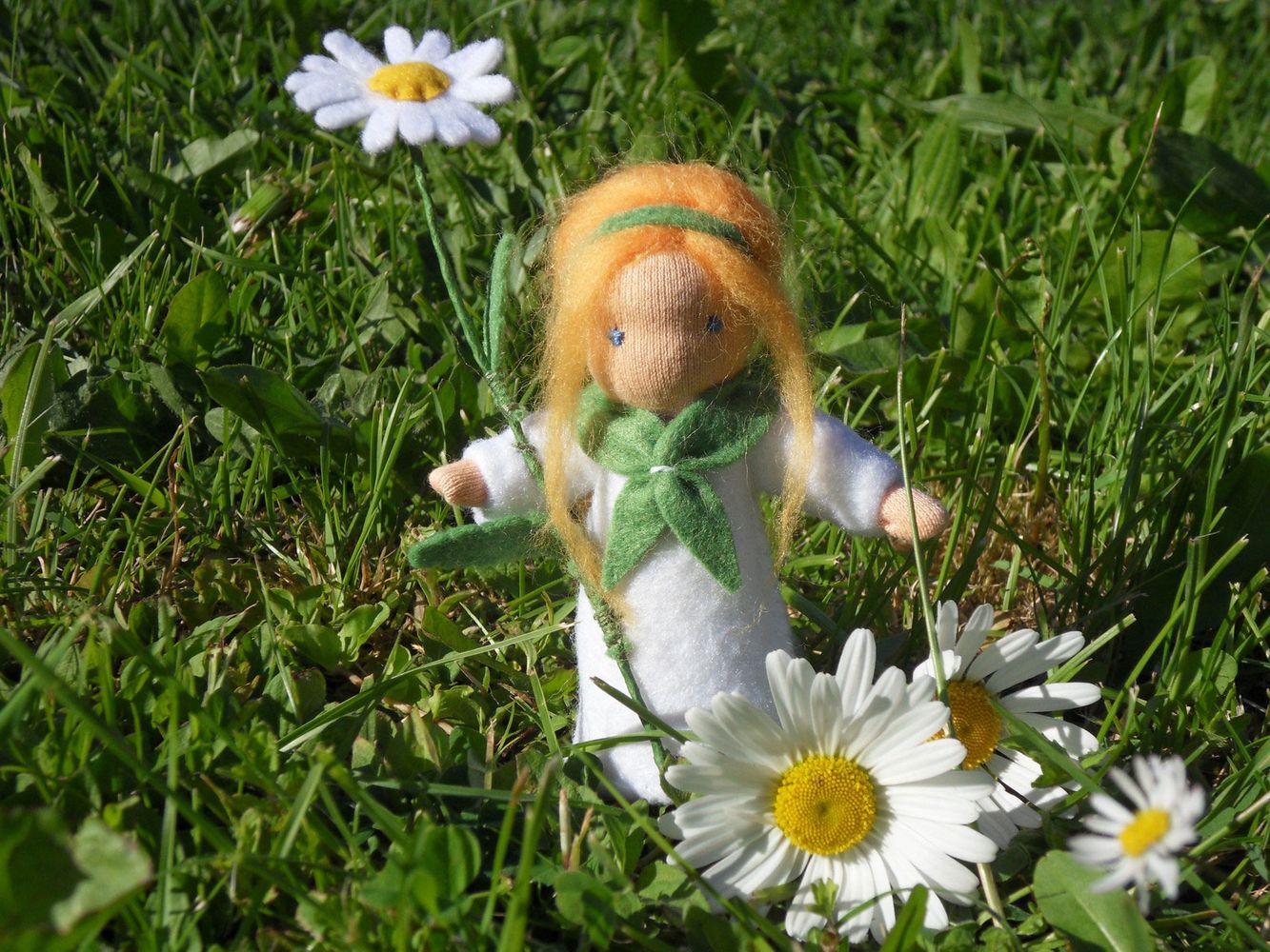 Kopretinová panenka je ušitá z přírodních materiálů, hlavička je vyvázaná klasickou technikou pro šití waldorfských panenek. Celá panenka je vyplněná ovčím rounem. V ruce drží panenka kvítek kopretiny vyrobený z filcu. Výška celé postavičky včetně kvítku je cca 13 cm.