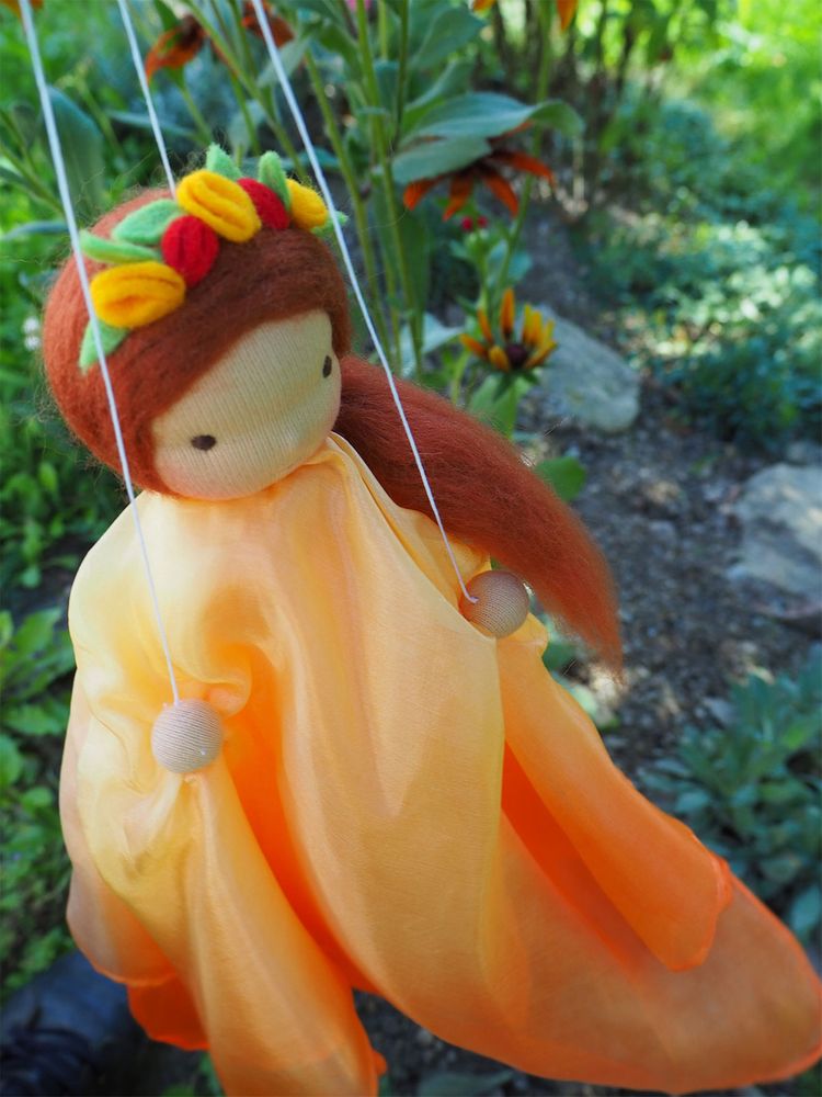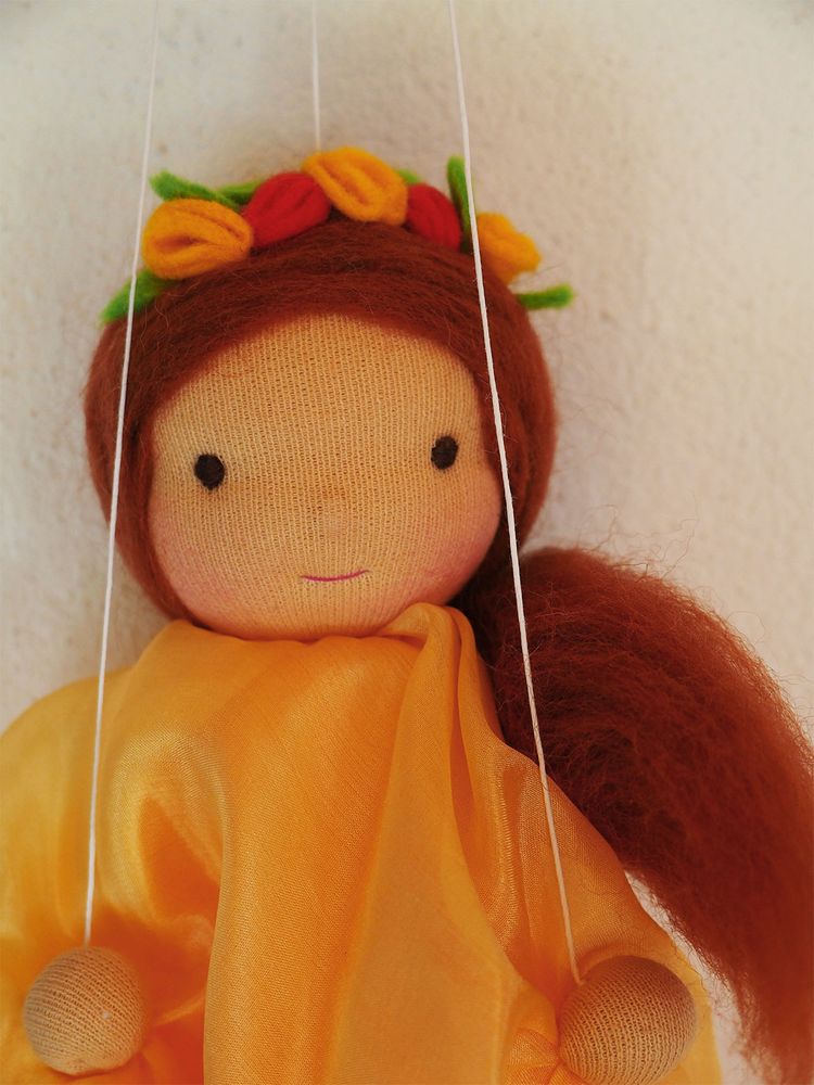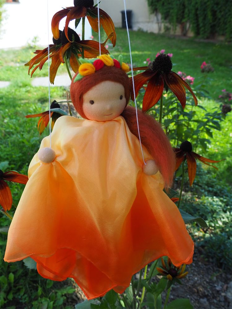 Víla je vyrobena z hedvábných šátečků laděných do oranžova, hlavička je vyvázaná klasickou technikou pro šití waldorfských panenek. Hlavička a ruce jsou vyplněny ovčím rounem. Ruce víly lze ovládat pomocí provázků.