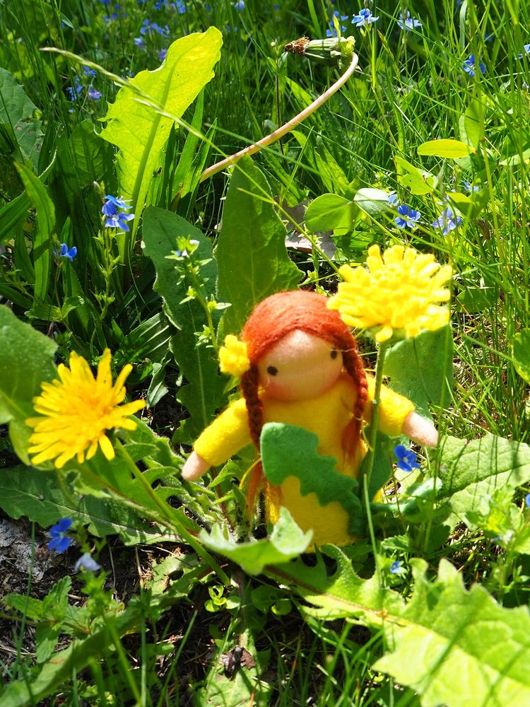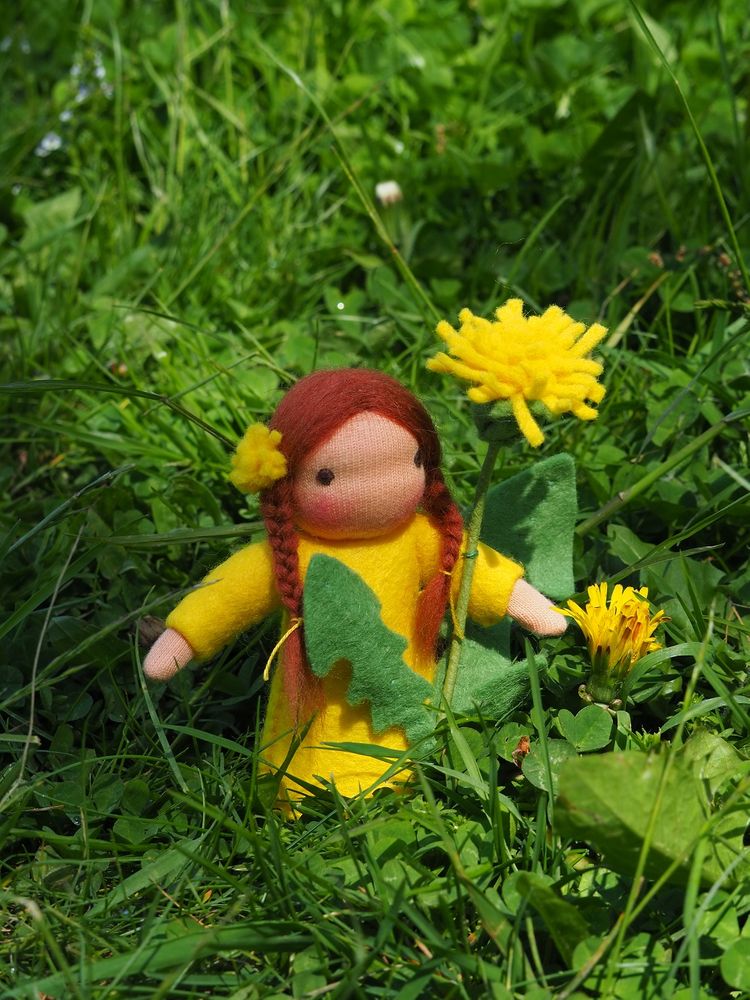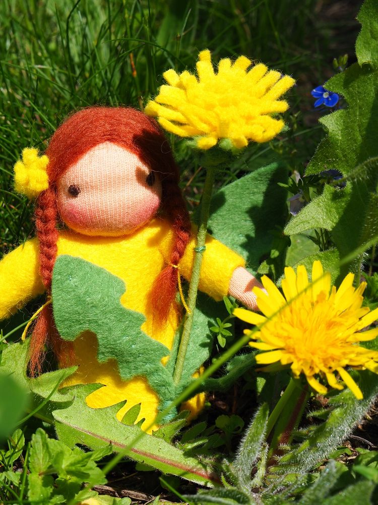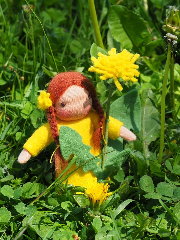 Panenka je ušitá z přírodních materiálů, hlavička je vyvázaná klasickou technikou pro šití waldorfských panenek. Celá panenka je vyplněná ovčím rounem. Výška postavičky včetně kvítku je cca 11 cm.