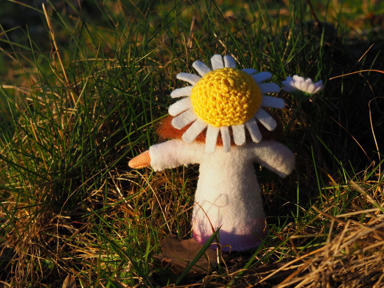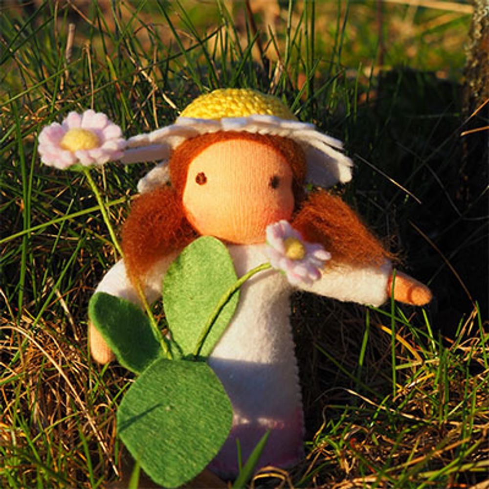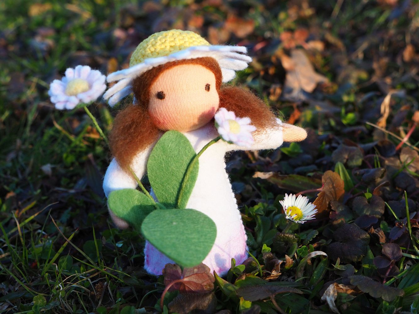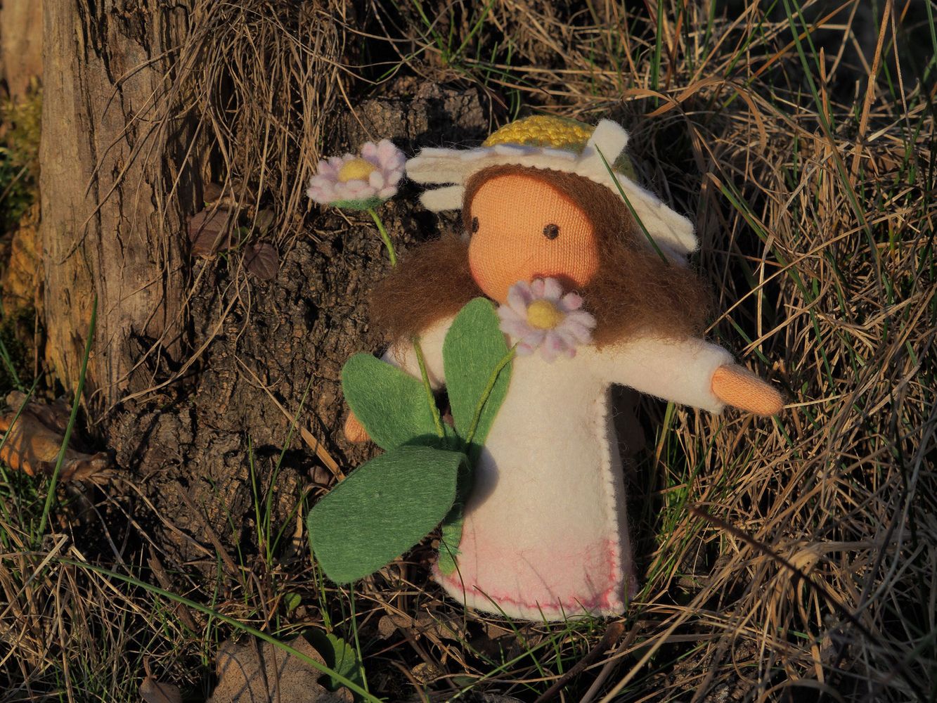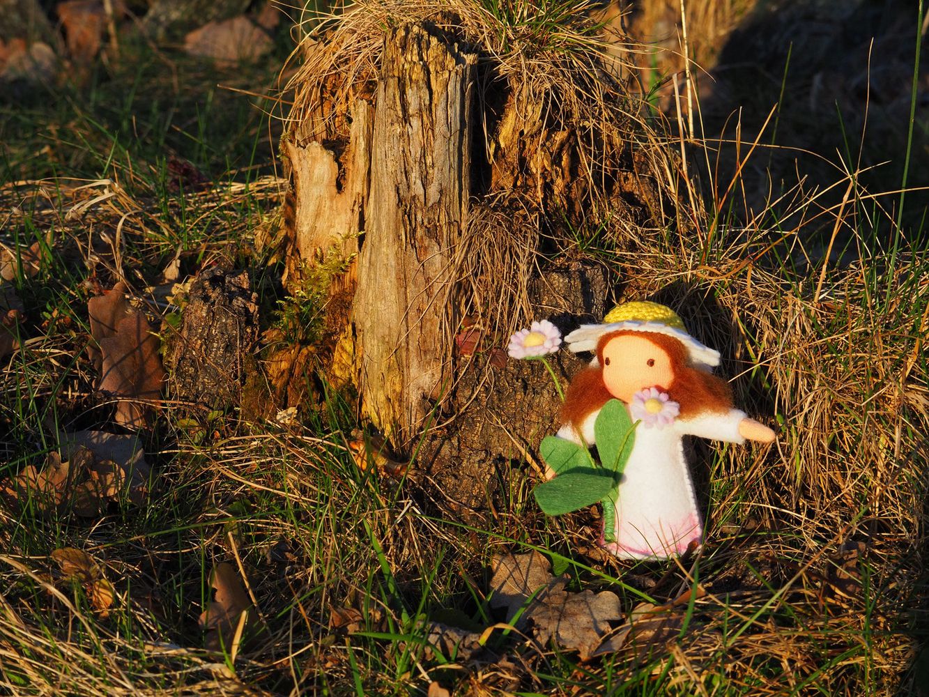 Panenka je ušitá z přírodních materiálů, hlavička je vyvázaná klasickou technikou pro šití waldorfských panenek. Celá panenka je vyplněná ovčím rounem. Výška postavičky včetně kvítku je cca 10 cm. Na hlavě má panenka háčkovaný klobouček ozdobený bílými lístky.