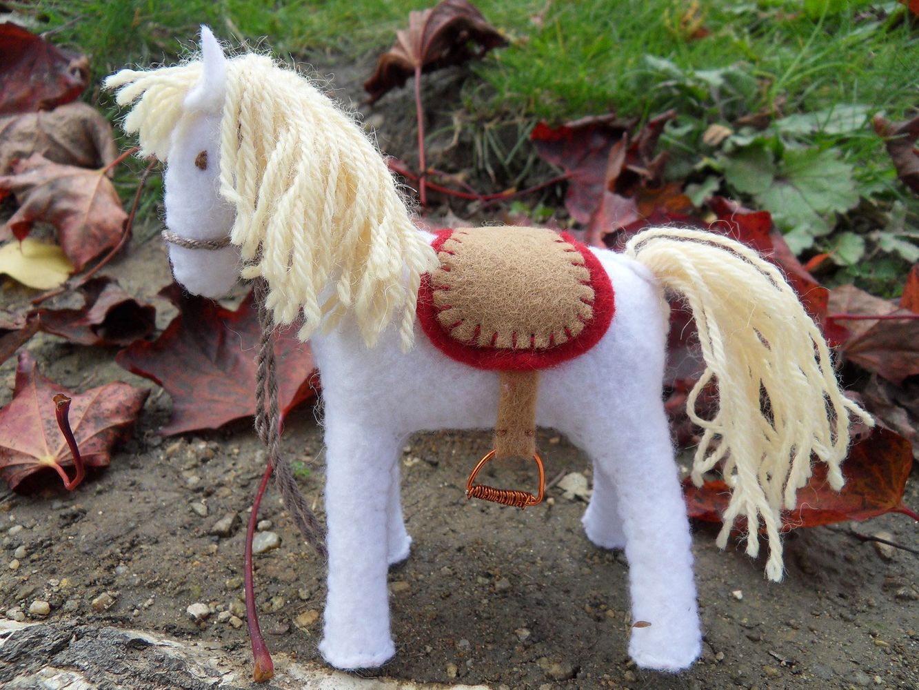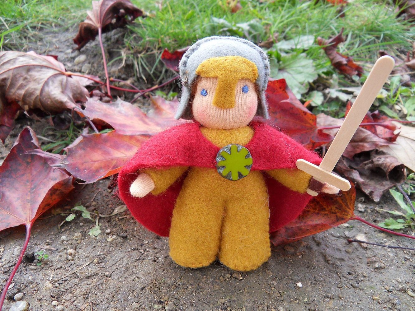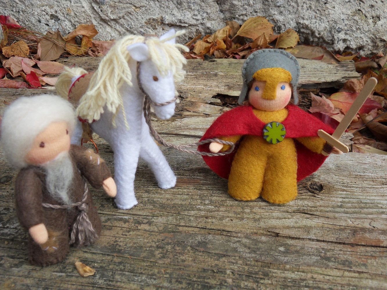 Sestava tří postaviček: sv. Martina, žebráka a bílého koně. Postavičky jsou ušité z filcu, hlavička je vyvázaná klasickou technikou pro šití waldorfských panenek. Všechny tři postavičky jsou vyplněné ovčím rounem. Svatý Martin drží v ruce dřevěný mečík, na hrudi má jako sponu přišitý zelený skleněný korálek. Výška postaviček cca 10 cm, koník má výšku cca 12 cm.