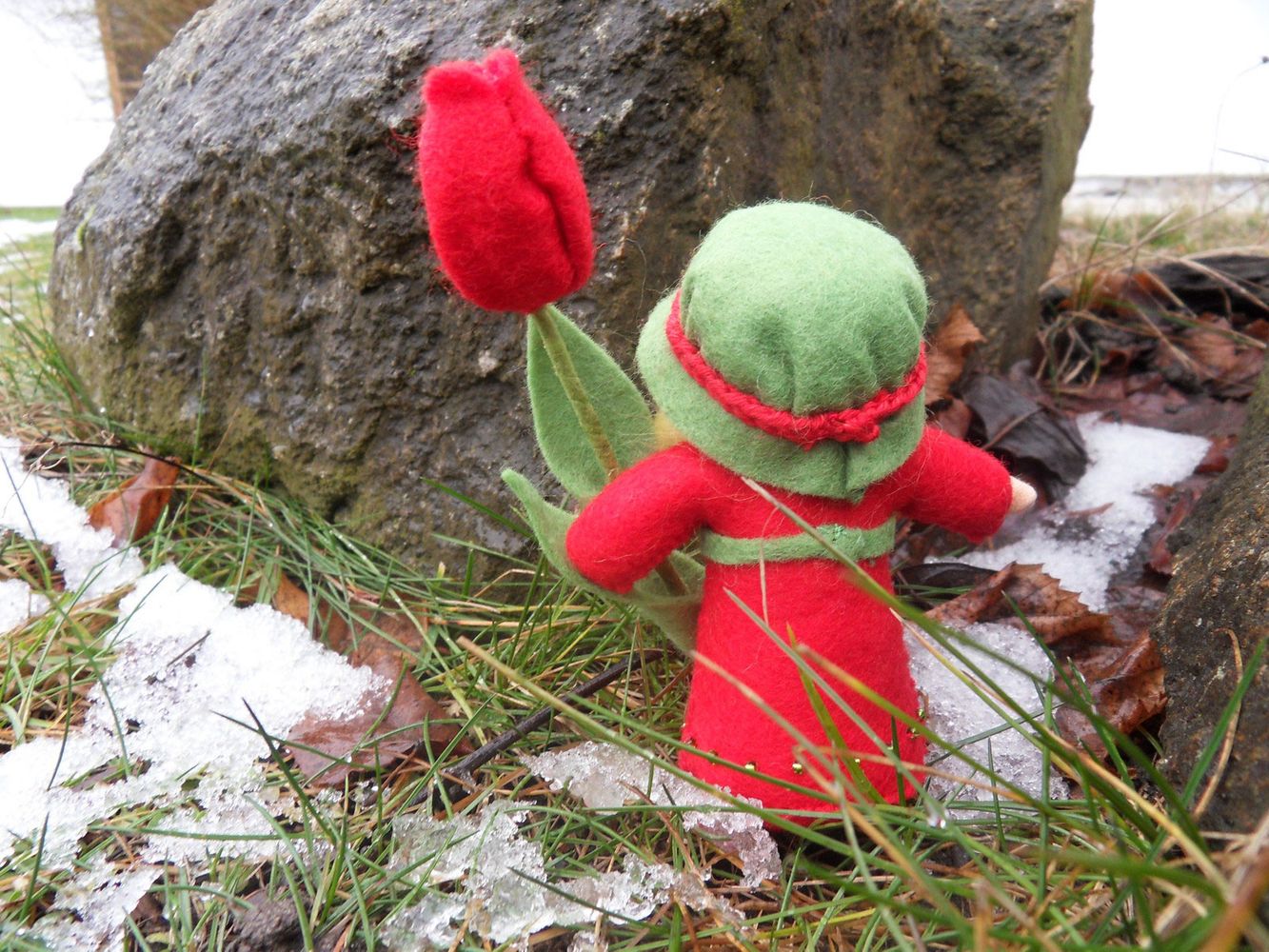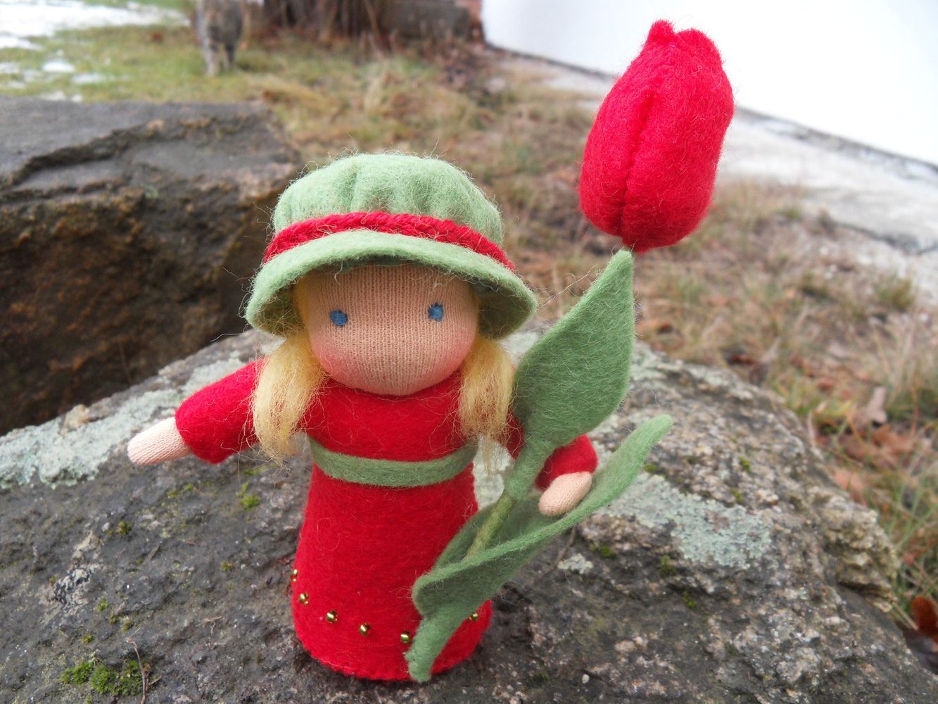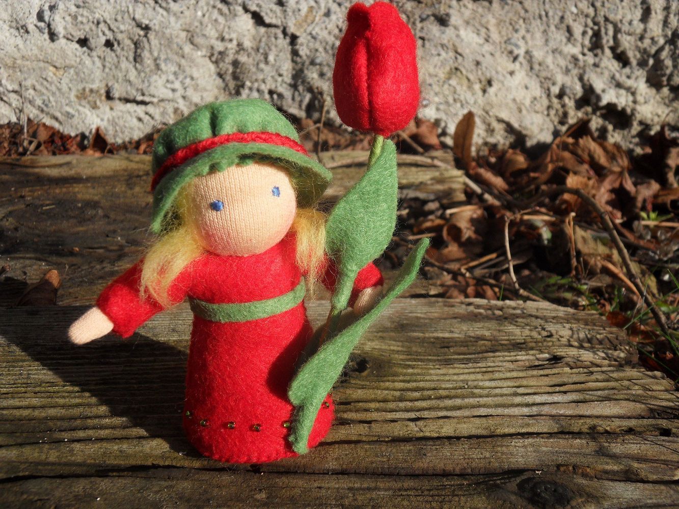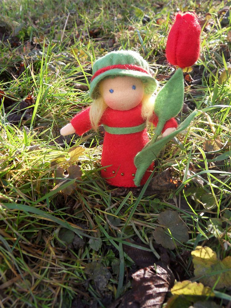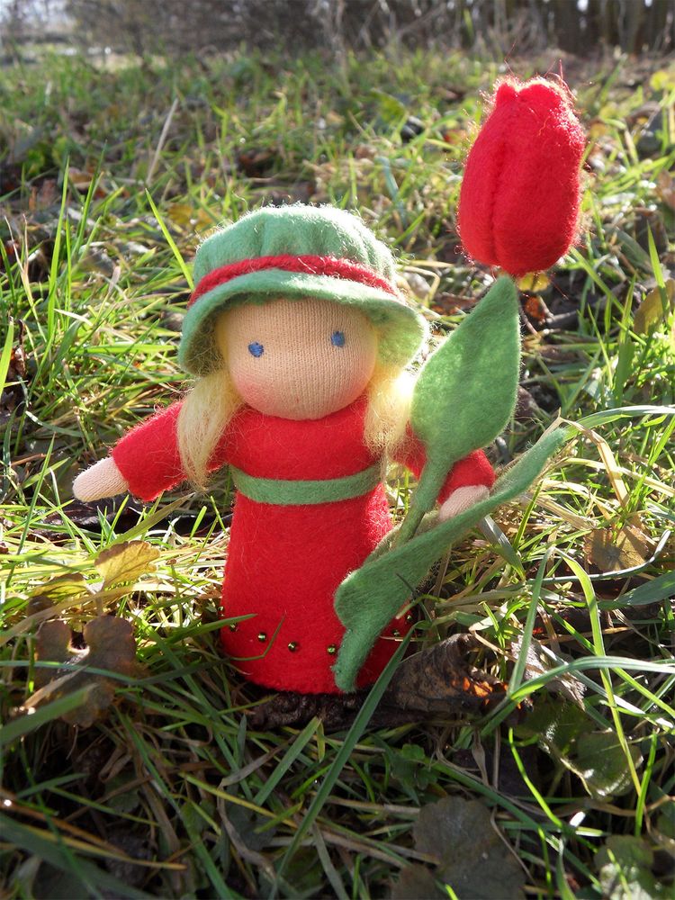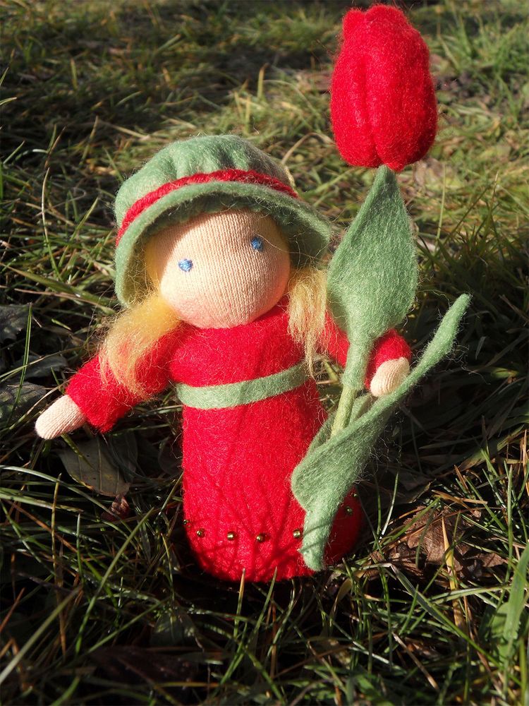 Tulipánová panenka je ušitá z přírodních materiálů, hlavička je vyvázaná klasickou technikou pro šití waldorfských panenek. Spodní okraj sukýnky je pošitý drobnými skleněnými korálky. Celá panenka je vyplněná ovčím rounem. Výška celé postavičky je cca 13 cm.