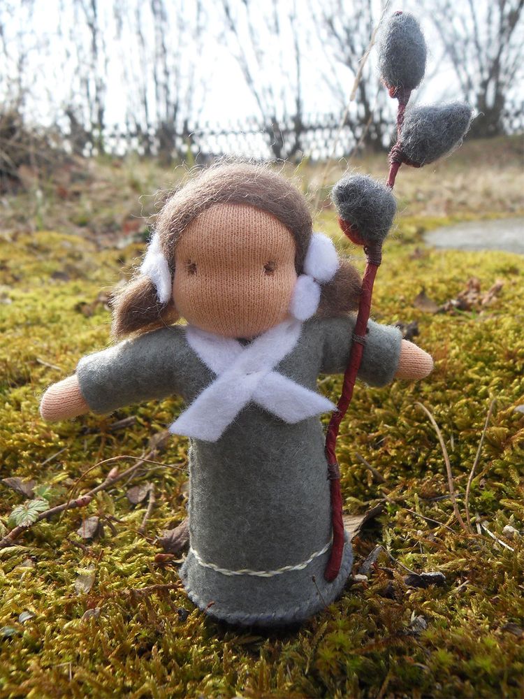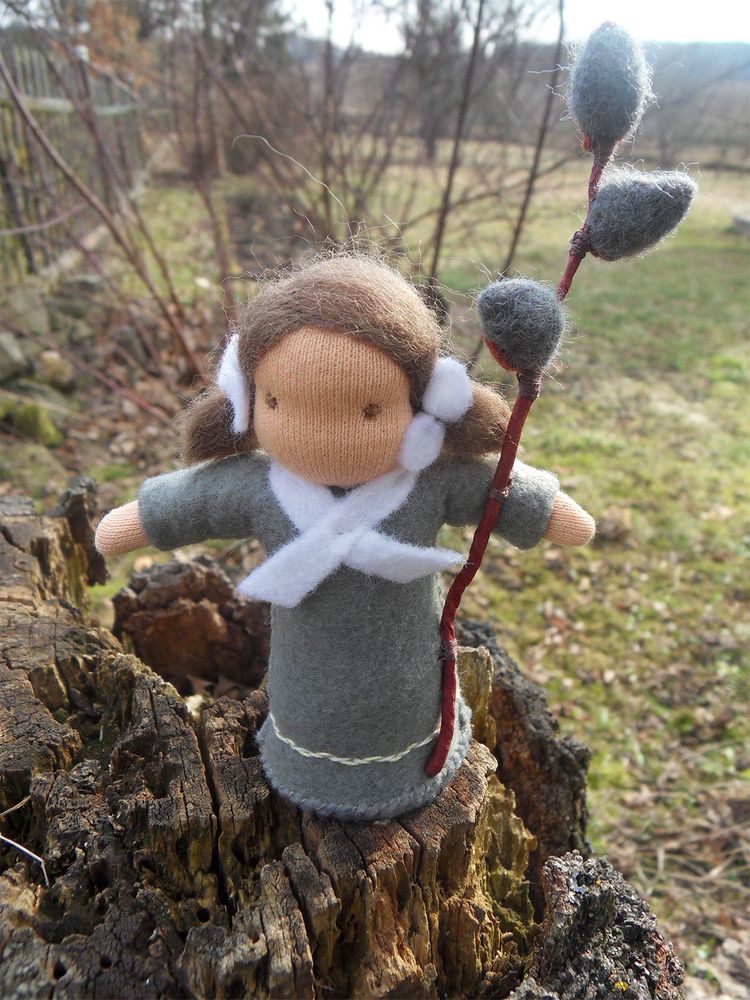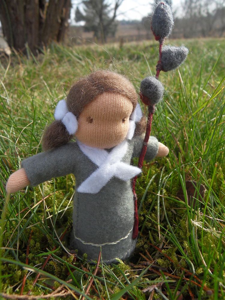 Vrbová panenka je ušitá z přírodních materiálů, hlavička je vyvázaná klasickou technikou pro šití waldorfských panenek. Celá panenka je vyplněná ovčím rounem. V ruce drží panenka větvičku kočiček vytvořených z vlny metodou suchého plstění. Výška celé postavičky včetně vrbové větvičky je cca 13 cm.