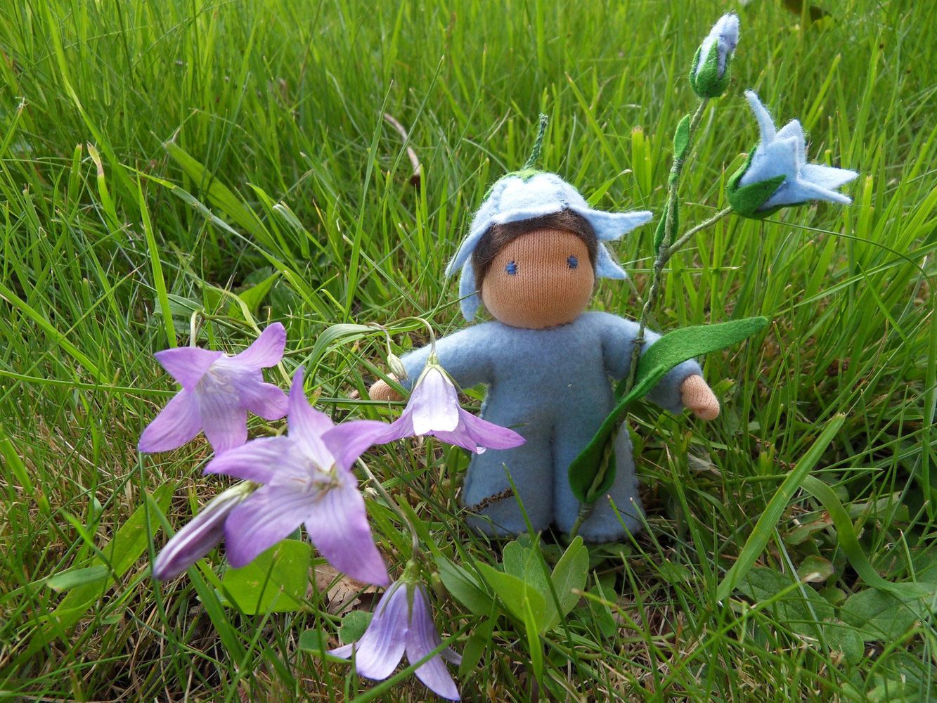 Zvonkový panáček je ušitý z přírodních materiálů, hlavička je vyvázaná klasickou technikou pro šití waldorfských panenek. Celý panáček je vyplněn ovčím rounem. V ruce drží panáček květ zvonku vyrobeného z filcu. Výška celé postavičky včetně kvítku je cca 13 cm.